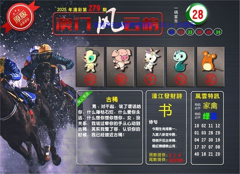 279期:六肖中特〖马猪牛狗蛇猴〗开:兔27错 |